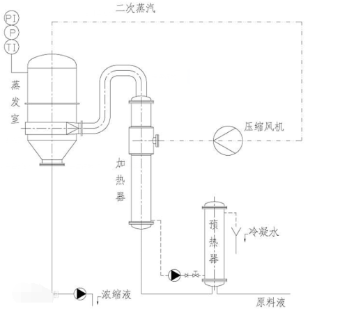 結(jié)構(gòu)組成:過濾系統(tǒng)、預(yù)熱系統(tǒng)、板式加熱器、物料泵、分離器、除霧器、蒸汽洗滌塔、蒸汽壓縮機(jī)